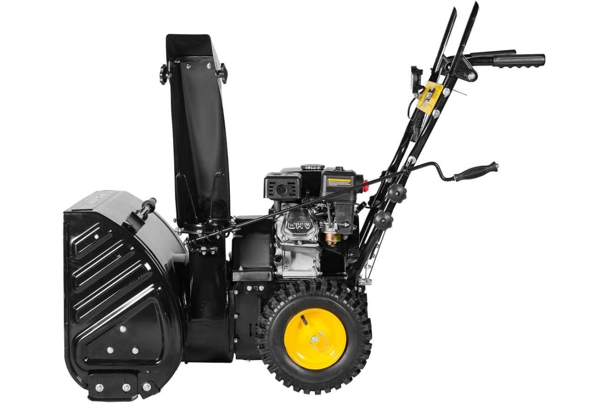 Установка оснащена бензиновым двигателем мощностью 7 л. с. с верхним расположением клапанов, адаптированным под работу при низких температурах. В качестве горючего используется обычный бензин АИ-92, который заливается в бак емкостью 3,6 л. Бензиновая модель мобильна и автономна, может использоваться в любых местах без привязки к электросети. Для упрощения запуска агрегат имеет электростартер, в случае разрядки АКБ можно воспользоваться ручным стартером. Модель оснащена ковшом размером 56х54 см и металлическим шнеком, который благодаря прочности и надежности конструкции легко измельчает даже твердые пласты снежного покрова. Снег выбрасывается в сторону на 15 м, при этом направление выброса можно легко поменять с помощью соответствующей ручки. Снегоуборщик имеет 2 ведущих надувных колеса с качественным рельефным протектором, который обеспечивает хорошее сцепление с поверхностью и исключает скольжение. Самоходная установка может двигаться вперед и назад, имеет 5 скоростных уровней вперед и 2 реверсные скорости.