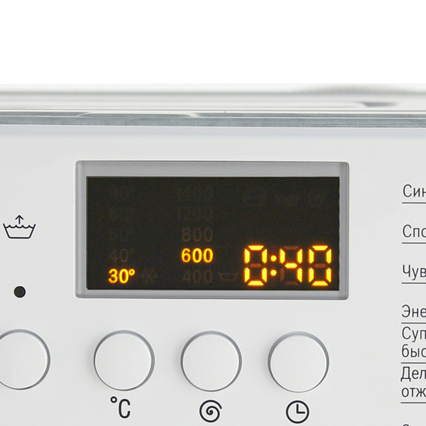 Предельная загрузка барабана составляет 7 кг. Кроме программ стирки прибор имеет функции разрыхления белья после отжима, предварительной стирки, звукового сигнала после окончания стирки.