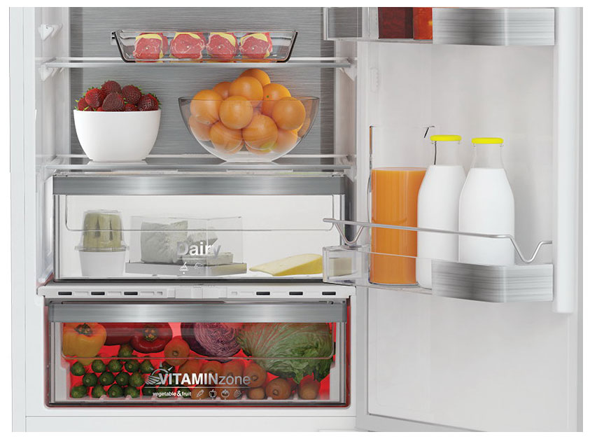 Двухкамерный встраиваемый холодильник с нижней морозильной камерой, двухконтурной системой охлаждения Total No Frost (Ноу Фрост) и инверторным компрессором. Технология VitaminZone с трехцветной подсветкой в ящике для овощей и фруктов сохраняет витамины дольше, имитируя световой цикл. Специальный отсек с температурой 0-3 °С в холодильной камере предназначен для более долгого хранения свежего мяса, рыбы и молочных продуктов. Холодильник предлагает множество практичных функций, а также удобное электронное управление и большой объем.