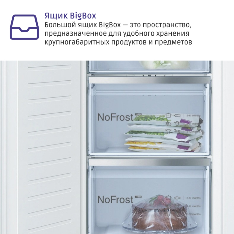 Встраиваемая морозильная камера Bosch GIN81AEF0U оснащен системой VarioZone вы можете регулировать внутренне пространство полок, как вам удобно. Имеется функция суперзаморозки, устройство само определяет уровень холода и выставляет значения. Ящик BigBox предназначен для хранения крупногабаритных продуктов тортов или пицца.